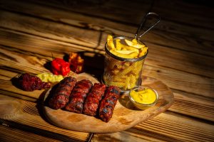 Cartofii prajiti si mustarul nu sunt incluse.
