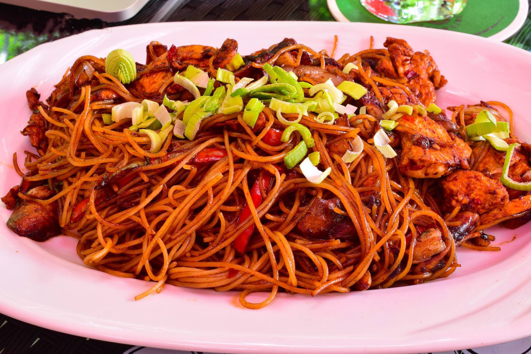 spaghete de orez, carne de vita, urechi de lemn, ardei gras, telina, morcovi, usturoi, ceapa verde, sos soia, sos picant